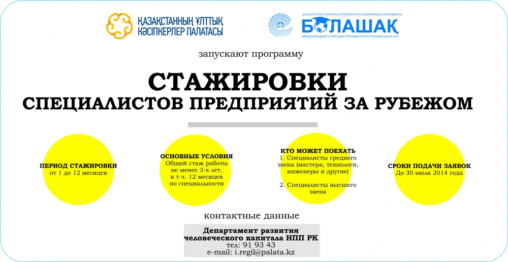 Национальной палатой предпринимателей и АО "Центр международных программ" запущена программа, по которой кандидатам предоставляется стажировка за рубежом на ведущих предприятиях США, Германии, Кореи и других стран, сообщает сайт Palata.kz. По информации организаторов, стажировка за рубежом предусматривается для специалистов из сфер энергетики, строительства, медиасферы, медицины, сельского хозяйства и других отраслей экономики.
