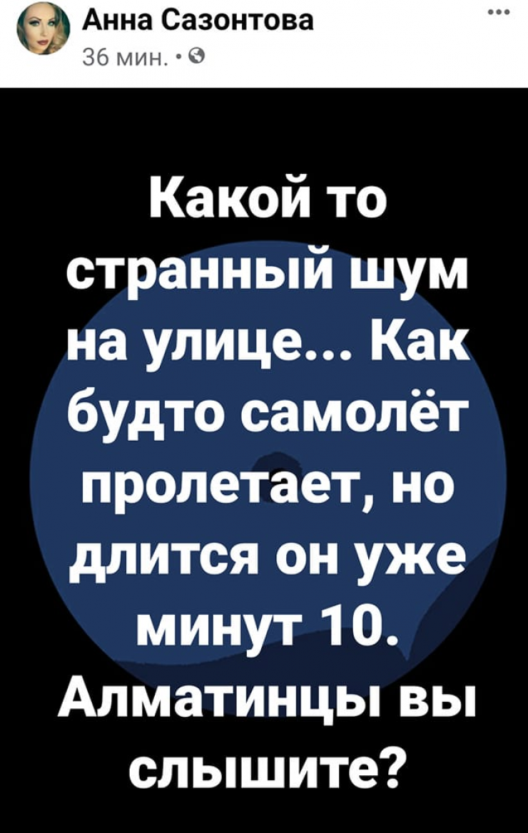 "Гул слышен из окна со стороны проспекта Абая. Думал, самолет, но уже 30 минут гудит. Вряд ли метро, вряд ли вытяжка кафе", - написал один из пользователей.