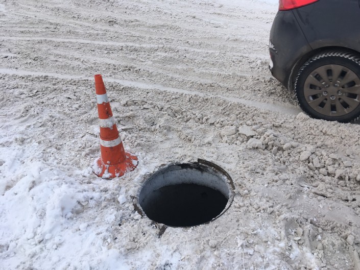 Опасения родителей оказались не напрасными. Уже на подходе к школе виден еще один открытый канализационный колодец, который старательно обходят идущие в школу дети. Кроме предупреждающего дорожного конуса, никаких ограждений нет.