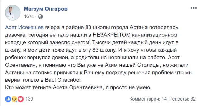 Некоторые жители по старой привычке обращаются за помощью в Facebook к экс-акиму столицы, ныне руководителю Администрации Президента Асету Исекешеву.