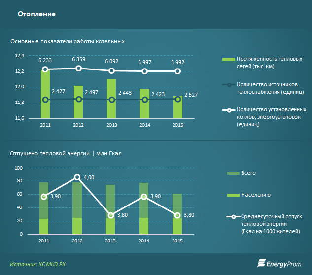 По итогам 2015 года протяженность теплосетей в стране составляла 11,89 тысячи километров - на 0,7 процента меньше, чем в 2014 году. При этом количество источников теплоснабжения выросло до 2,53 тысячи - на 4,2 процента за год. Число энергоустановок осталось прежним - почти шесть тысяч.