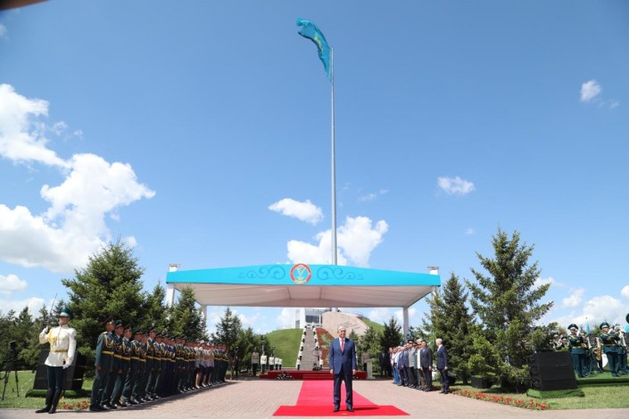 "Дорогие соотечественники, торжественная церемония подъема Государственного Флага по традиции открывает праздничные мероприятия, посвященные Дню столицы. В момент, когда знамя Казахстана взмывает высоко над землей, наши сердца наполняются чувством гордости за нашу страну, за все достижения, которыми мы обязаны нашей независимости. С момента своего становления наша столица стала зримым воплощением успеха казахстанской модели развития. Это стало достойной оценкой исторических заслуг Елбасы в объединении нации и построении нашей государственности. Сегодня флаг Казахстана знают во всем мире как символ миролюбивой и взвешенной политики, нацеленной на обеспечение безопасности и стабильности в регионе и на всей планете", - сказал Президент на церемонии поднятия флага в этномемориальном комплексе "Атамекен".
