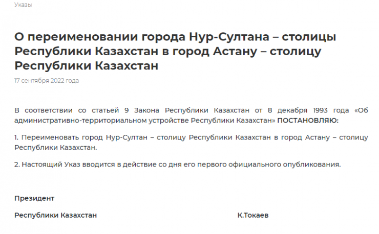 Президент Касым-Жомарт Токаев подписал указ о переименовании столицы Казахстана в Астану, передает Tengrinews.kz со ссылкой на сайт Акорды.