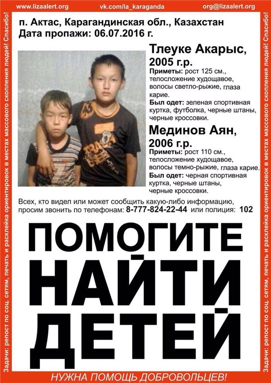 Мальчики, 11-летний Акарыс Тлеуке и 10-летний Аян Мединов, пропали 6 июля в поселке Актас, Карагандинской области. По информации волонтеров, в полицию заявление о пропаже детей подал отец. Ребята играли и ушли со двора в первой половине дня. После этого их никто не видел.