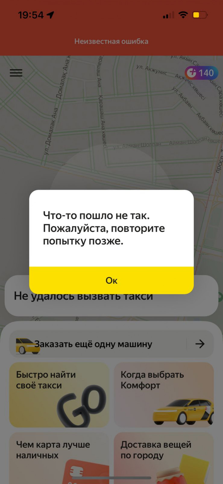 При вызове такси на экране смартфонов появлялось сообщение о неизвестной ошибке: "Что-то пошло не так, пожалуйста, повторите попытку позже".