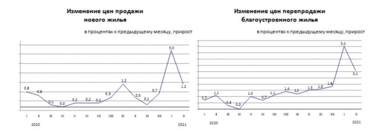 "За месяц (февраль 2021 года к январю 2021 года) цены перепродажи благоустроенного жилья повысились на 3,1 процента, продажи нового - на 1,2 процента. Арендная плата за благоустроенное жилье стала выше на 1,6 процента", - говорится в сообщении.