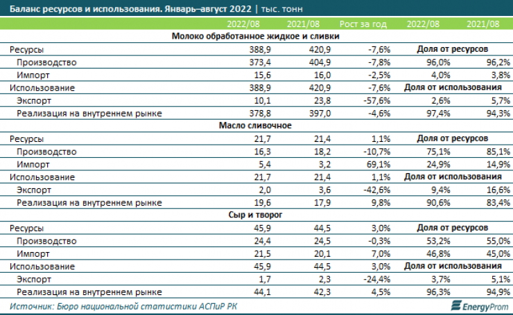 По итогам января – августа текущего года местные компании обеспечили спрос (реализацию на внутреннем рынке плюс экспорт) на обработанное жидкое молоко и сливки на 96 процентов. За этот период в стране произвели 373,4 тысячи тонн продукции, импортировали - 15,6 тысячи тонн. На экспорт отправили 10,1 тысячи тонн продукции, оставшиеся 378,8 тысячи тонн реализовали на внутреннем рынке.
