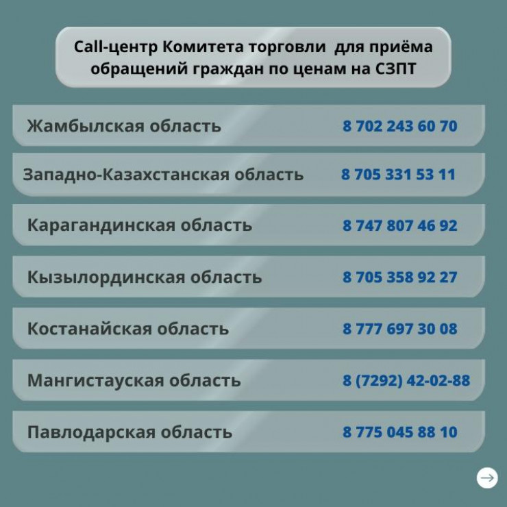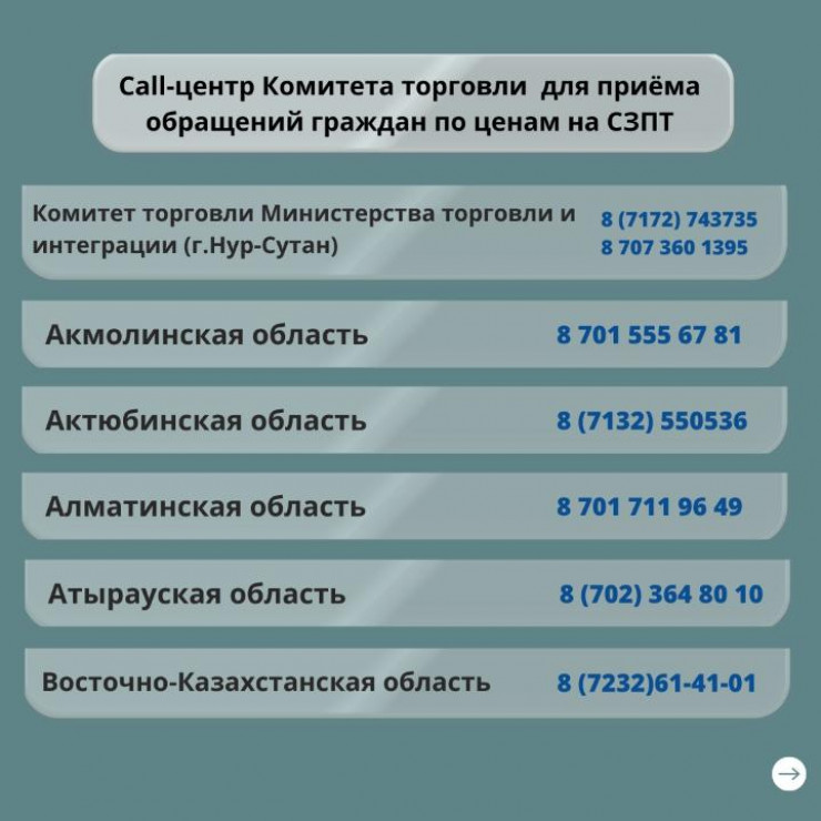 Call-центр для обращений казахстанцев создан во всех регионах страны. По данным ведомства, он создан для повышения достоверности анализа данных и учета обращений граждан, столкнувшихся с завышенными ценами на социально значимые продукты питания в магазинах у дома, рынках, супермаркетах и других организованных местах торговли.