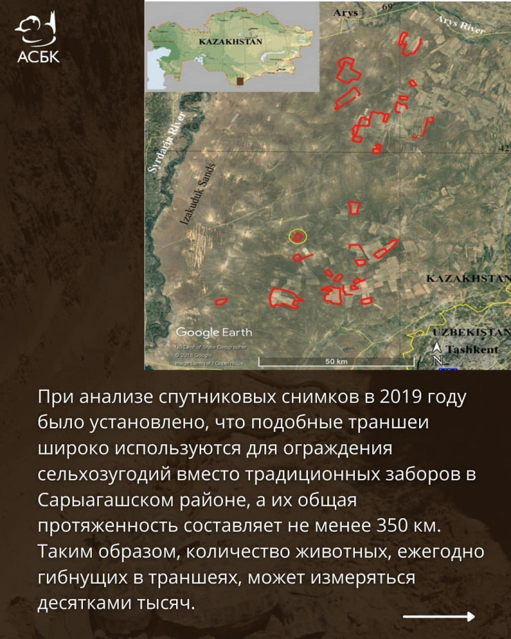 "Проблема нуждается в скорейшем решении и принятии конкретных мер по предотвращению массовой гибели животных в оградительных траншеях. В 2019-20 годах АСБК и Институт зоологии МОН РК официально обращались в государственные уполномоченные органы областного и республиканского уровня", - сообщили в ассоциации сохранения биоразнообразия.