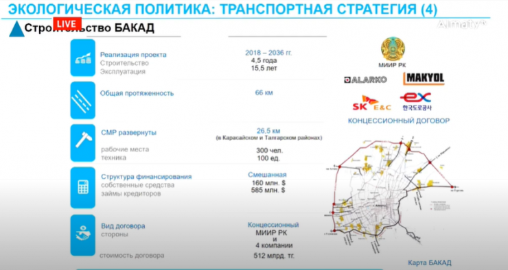 Также глава города высказался о строительстве БАКАД. Сагинтаев отметил, что по данному проекту идут строительные работы со стороны области. Аким считает, что эксплуатация данной развязки положительно скажется на качестве воздуха в городе.