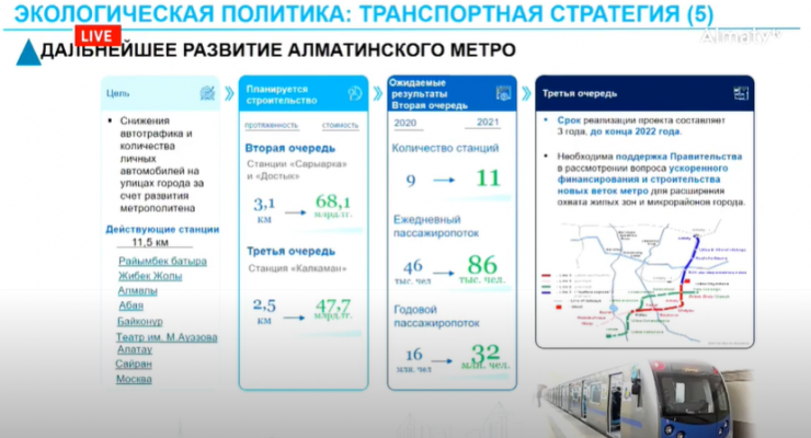 "Строительство метро продолжается. Вы знаете, что это тяжело и сложно, с тяжелым финансированием, но идем дальше, не останавливаемся", - сказал аким города в ходе пресс-конференции в режиме онлайн.