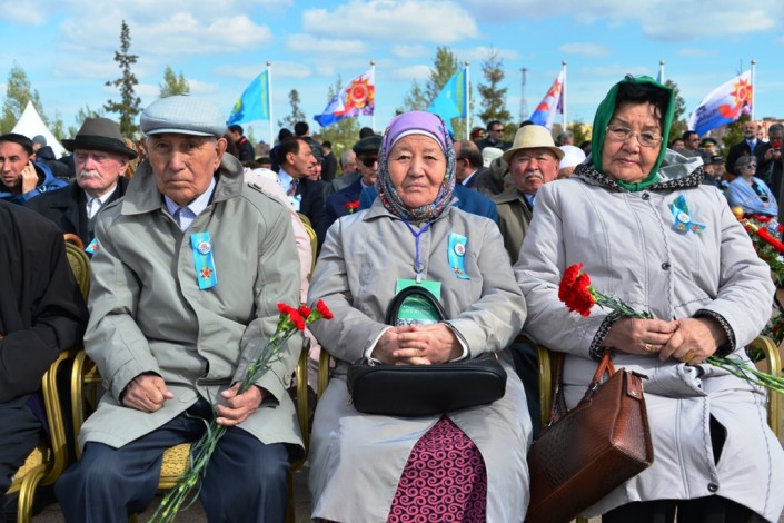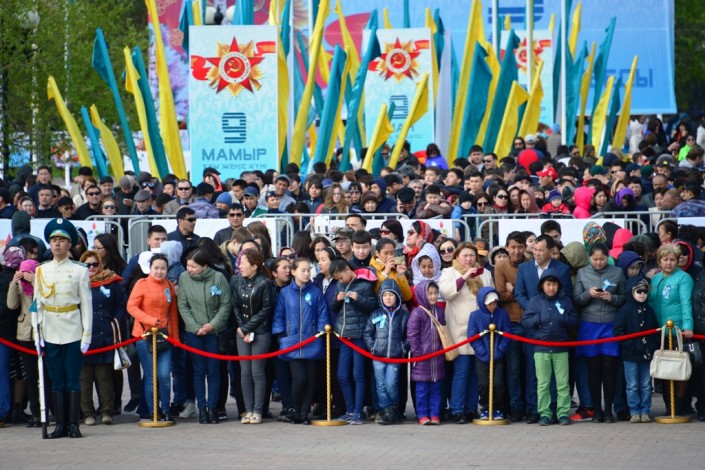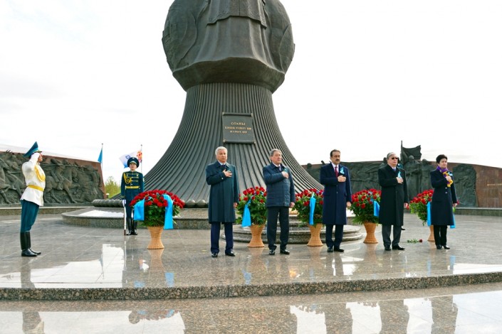 Памятник "Отан қорғаушылар" в этот день увенчали тысячи гвоздик. Возложение цветов сопровождалось музыкальными произведениями в исполнении Президентского оркестра Службы государственной охраны РК. Героев, сражавшихся на полях самой кровопролитной войны, тех, кто положил свои жизни на алтарь победы, почтили минутой молчания.