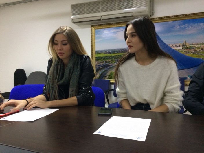 Слева - участница конкурса, записавшая прямой эфир Н.Лапкина, справа - Мисс "Хан Шатыр 2017" С.Сексенбаева