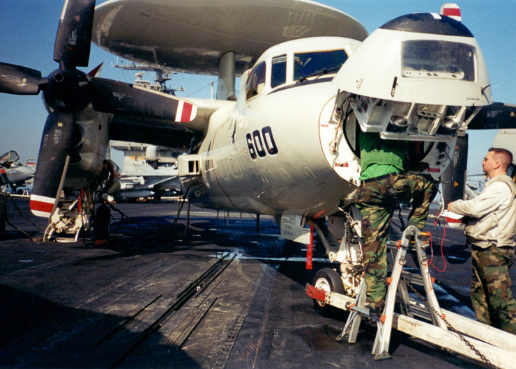Техобслуживание летающего радара Grumman E-2 Hawkeye.