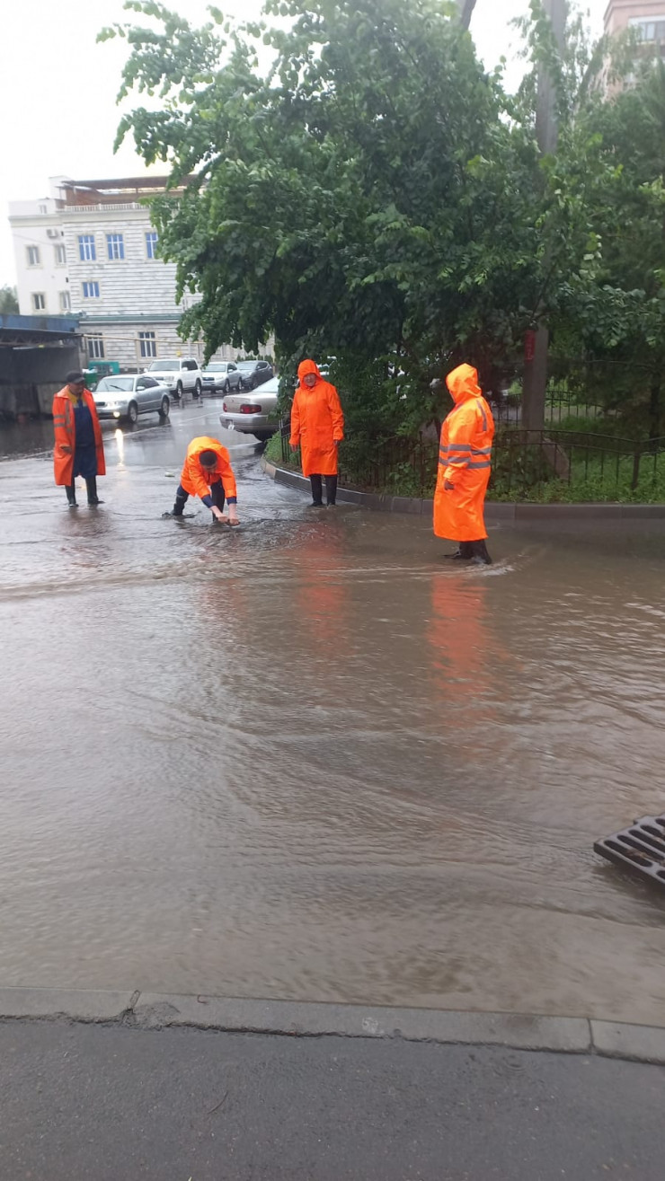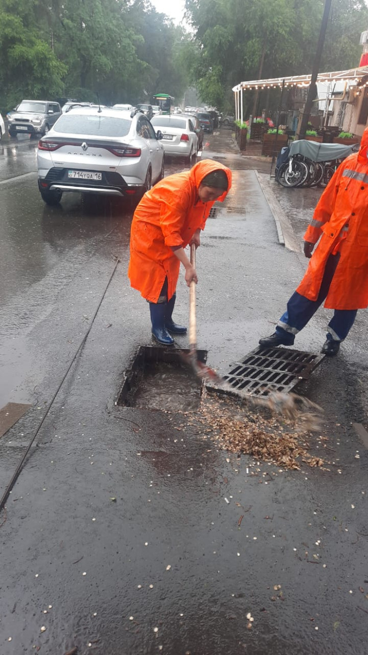 В акимате Алматы сообщили, что для ликвидации подтоплений организовано дежурство подрядных организаций. Для пропуска и откачки воды с улиц задействованы мобильные бригады общей численностью 609 человек, 252 единицы спецтехники и 24 мотопомпы. Заготовлено 2050 мешков с песком.