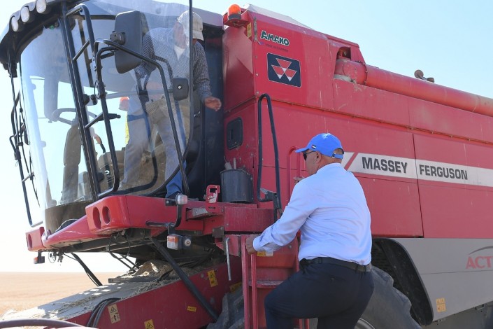 Аким Туркестанской области Умирзак Шукеев вместе с крестьянами вышел на посевные поля, где сел за руль комбайна и стал косить пшеницу, передает Tengrinews.kz со ссылкой на пресс-службу главы региона.