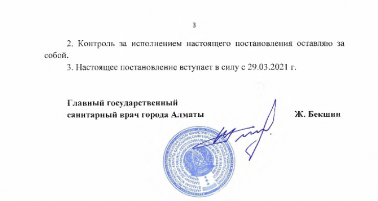 Постановление вступает в силу с 29 марта. Полный текст постановления опубликован на странице Департамента санитарно-эпидемиологического контроля города Алматы.