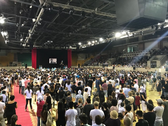 Люди заполняют трибуны дворца спорта.