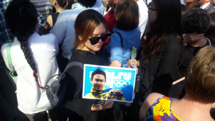 Очень много цветов, кто-то приносит мягкие игрушки. Люди не могут сдержать слез, смотря на фотографию Дениса Тена.