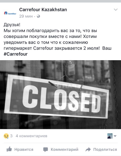 В официальных группах в социальных сетях сегодня утром было опубликовано сообщение: "Друзья, мы хотим поблагодарить вас за то, что вы совершали покупки вместе с нами! Хотим уведомить вас о том, что, к сожалению, гипермаркет Carrefour закрывается 2 июля! Ваш Carrefour".