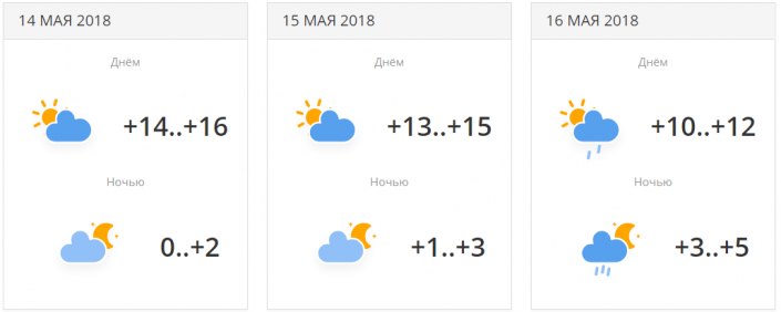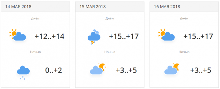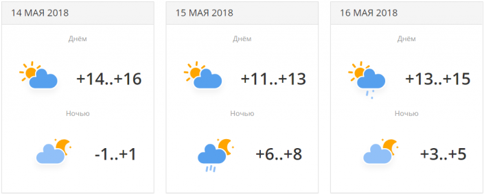 14 мая ночью ожидается минусовая температура: -1...+1. 16 мая - сильный дождь с грозой, +17...+19 градусов тепла.