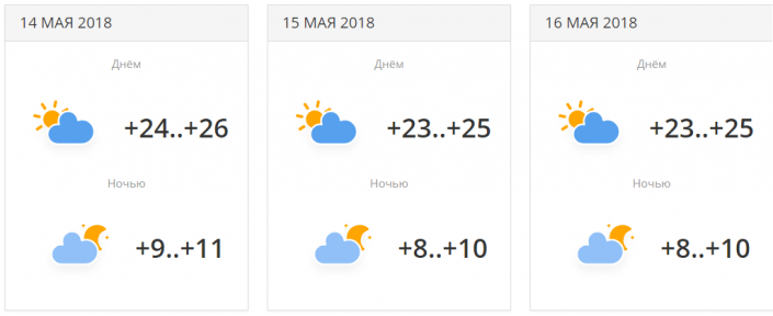 С 14 по 16 мая ожидается переменная облачность, температура установится в районе +26...+28 градусов днем и +15...+17 градусов ночью.
