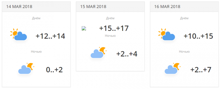 Ночные осадки, и дневная гроза 15 мая. Температуры будут находится в районе +12...+17 градусов днем и около 0...+5 градусов ночью.