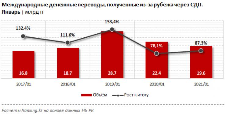 Среди стран, из которых в Казахстан были отправлены средства, традиционно лидирует Россия: оттуда в январе 2021 года было получено 4,2 миллиарда тенге, впрочем, сразу на 35,1 процента меньше, чем в январе 2020-го.