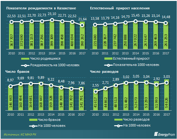 Показатели рождаемости сокращаются и по итогам 2017-го составили всего 21,6 родившихся на 1 000 человек. Также три года подряд сокращается и естественный прирост, составив к началу 2017 года всего 14,5 человек на тысячу жителей РК.