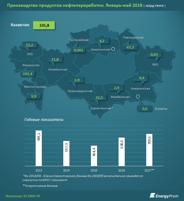 Почти 84 процента производства пришлось на ключевые регионы-нефтепереработчики - Атыраускую область (здесь расположен Атырауский нефтеперерабатывающий завод - АНПЗ), Павлодарскую (в области работает Павлодарский нефтехимический завод - ПНХЗ) и Туркестанскую, бывшую ЮКО (где размещен Шымкентский нефтеперерабатывающий завод "ПетроКазахстан Ойл Продактс" - ПКОП).