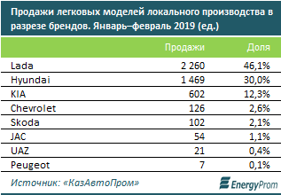 В союзе "КазАвтоПром" назвали пятерку наиболее востребованных брендов легковых авто казахстанской сборки по итогам двух месяцев текущего года: Lada (2 260 авто), Hyundai (1 469 машин), KIA (602 авто), Chevrolet (126 машин) и Skoda (102 автомобиля). В список марок, предлагаемых отечественными предприятиями, вошли также JAC (54 авто), UAZ (21 авто) и Peugeot (семь машин).
