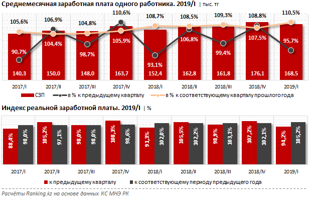 Среднемесячная номинальная заработная плата одного работника по РК за первый квартал 2019 года составила 168,5 тысячи тенге. Это 95,7 процента к прошлому кварталу, но при этом к первому кварталу 2018 года — 110,5 процента.