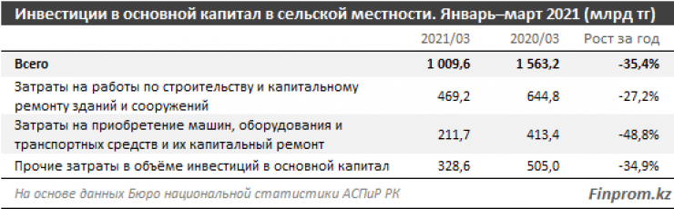 На каждого сельского жителя пришлось по 131 тысяче тенге капиталовложений за квартал против 202 тысяч годом ранее. За январь - март этого года инвестиции в основной капитал в сельской местности составили один триллион тенге - сразу на 35,4 процента меньше, чем годом ранее. Реальный спад составил 36,2 процента, передает Tengrinews.kz со ссылкой на Finprom.kz.