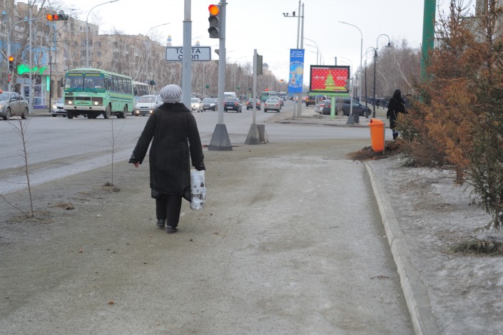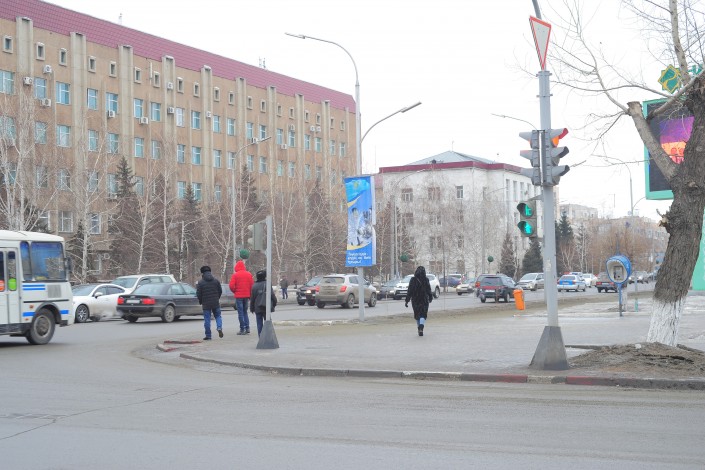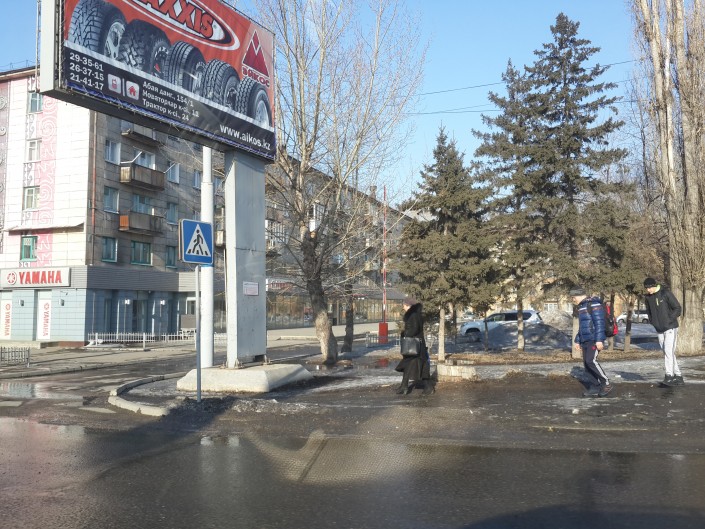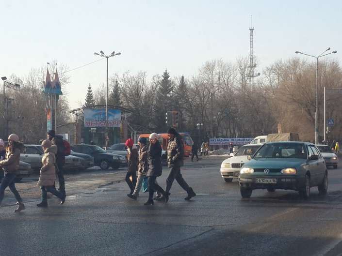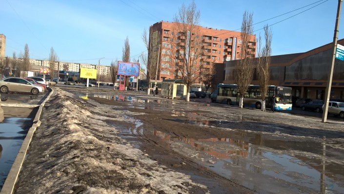 Между тем, в Актобе пасмурно. Утро морозное - минус 3. Но подмерзшие за ночь лужи все еще таят опасность для водителей. И, несмотря на непривычно безветренную погоду, актюбинцы одеты так же тепло, как и всегда в феврале.