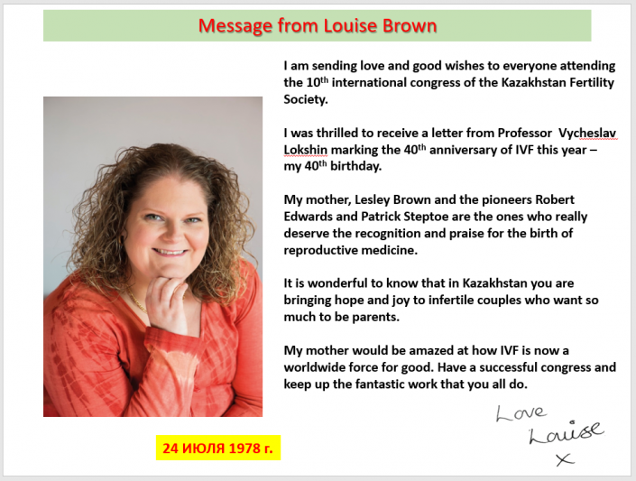 2018 год для нас, акушеров-гинекологов, знаковый. И не только потому, что нашему форуму и Казахстанской ассоциации исполняется 10 лет. 40 лет назад с помощью ЭКО родился первый человек на Земле. Это англичанка Луиза Браун. Она замужем, родила двоих детей, работает няней. Мы, кстати, получили от нее приветствие нашему форуму.