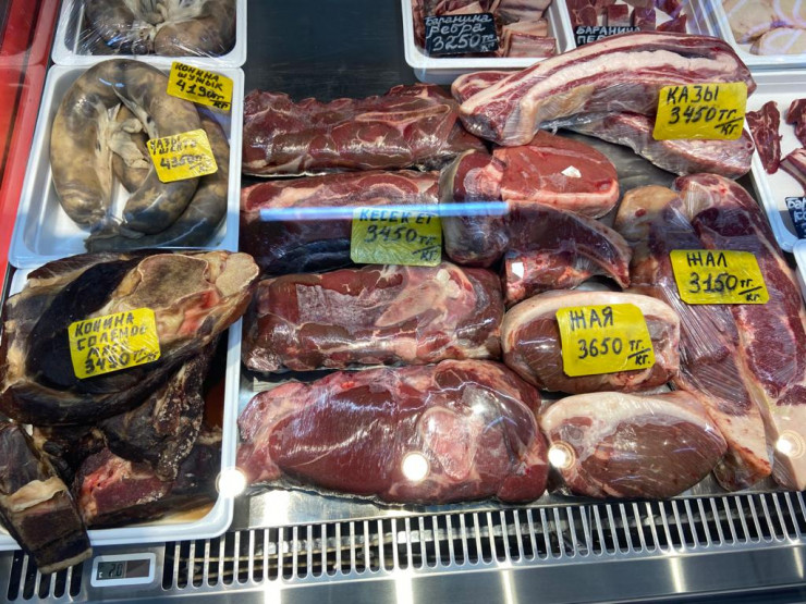 - мясо: килограмм шужыка - 4190 тенге, казы - 3450 тенге, жая - 3650 тенге;