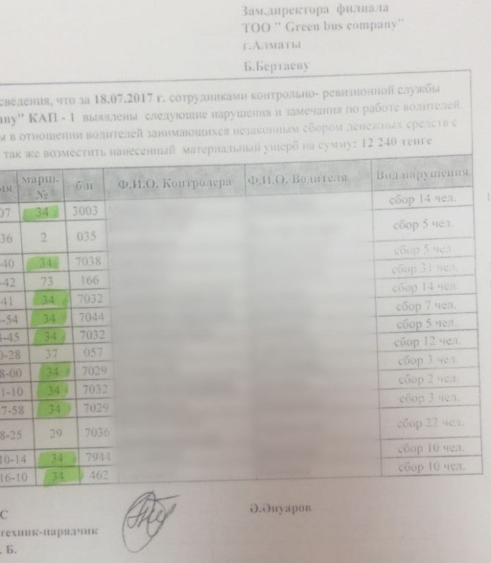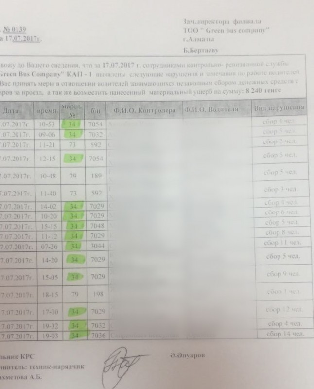 По его информации, водители, которые бастуют, не пробивают билеты пассажирам, которые платят наличными. Более 80 процентов нарушений невыдачи билетов приходится на 34 маршрут. Баурджан Кулишев поделился отчетами контролеров Green Bus Company о нарушениях водителями автобусов.