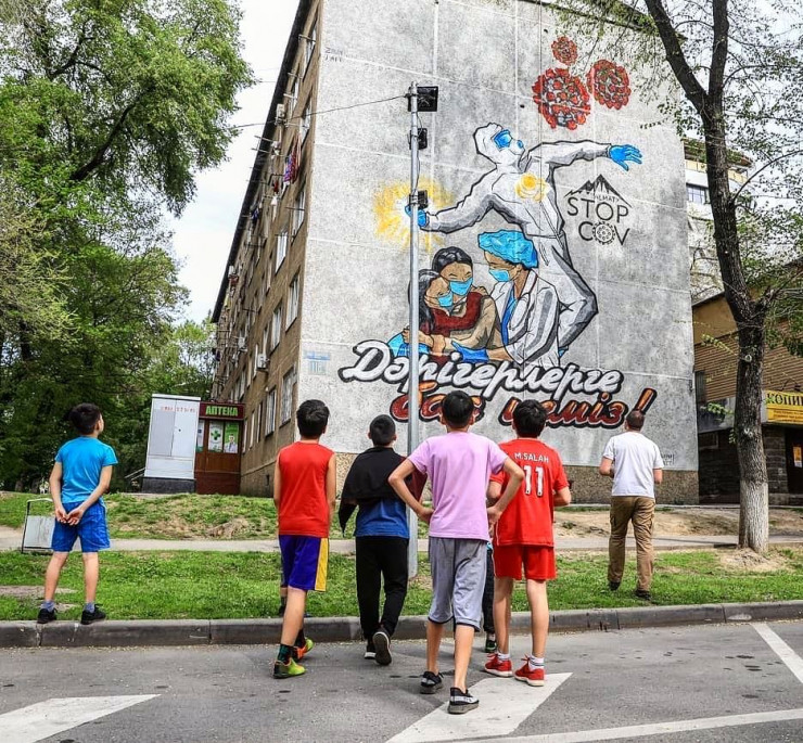 Автором этого мурала стал другой художник из Алматы Жумадил Елеукенов. Он провел в корзине подъемника "Кобра" почти неделю. Парень признался, что на это произведение его вдохновила мама-врач и ее коллеги.