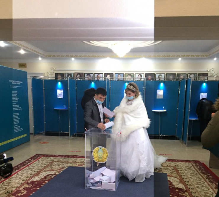 Нурболат и Карлыгаш - не единственные молодожены на выборах в Казахстане. В Нур-Султане 10 января поженились Ботагоз Калтаева и Фахат Жанбеков. Они голосовали на избирательном участке №144.