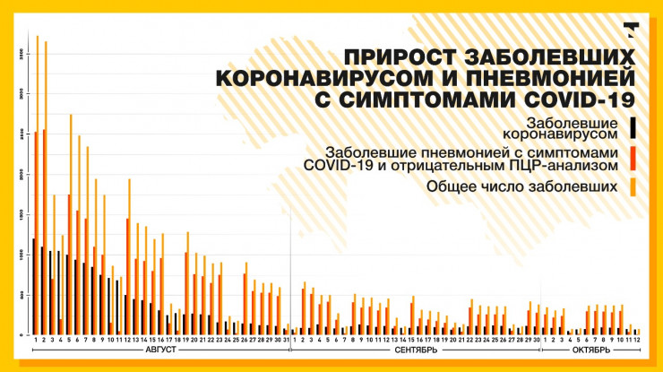 Ниже на графике показано, как менялось число новых заболевших коронавирусом и связанной с ним пневмонией за сутки. В первых числах августа общее число новых зараженных превышало три тысячи человек в день. А в сентябре максимальное число новых зараженных не превысило 700 человек в сутки.