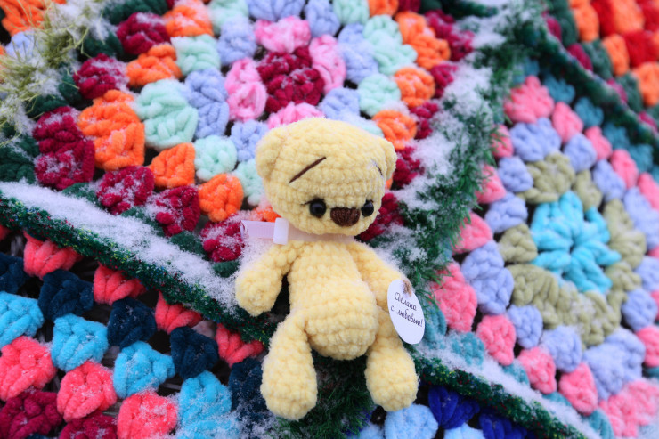 Вязаные квадраты из Нур-Султана и его пригорода, Алматы, Петропавловска, Актобе, Тараза, Караганды собрали в гигантское лоскутное одеяло и надели на металлическую конструкцию в форме елки. Нынешний арт-объект получился вдвое выше прошлогоднего. На новогоднюю инсталляцию потребовалось более 70 килограммов пряжи.