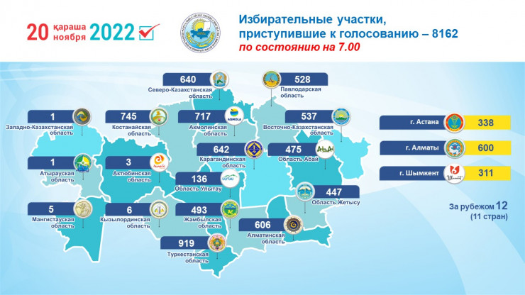 "По состоянию на 07.15 по времени столицы 20 ноября 2022 года в регионах 8150 участков приступили к голосованию. Также приступили к голосованию 12 участков при представительствах Республики Казахстан в 11 иностранных государствах", - сообщил Петров на брифинге в ЦИК.