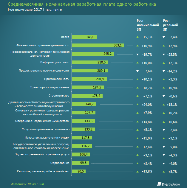 По итогам I полугодия 2017 среднемесячная номинальная заработная плата составляла 144,95 тысяч тенге - на 5,1 процента больше, чем в аналогичном периоде годом ранее.