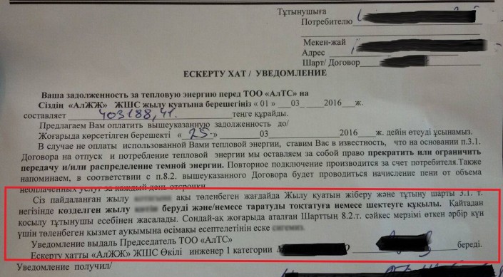 Хакеры обматерили горожан от имени ТОО "Алматинские тепловые сети". Фотографию уведомления о задолженности за отопление, в котором текст на казахском языке сопровождается нецензурными словами, на своей странице в Facebook опубликовал бывший глава компании Даурен Алимбеков, передает корреспондент Tengrinews.kz.