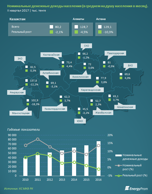 Примечательно, что покупательная способность доходов казахстанцев, несмотря на их номинальный рост, падает второй год подряд. Так, по итогам 2016 года с учетом инфляции реальный спад уровня доходов составлял 0,7 процента к 2015 году.