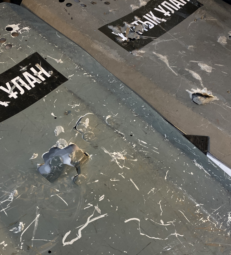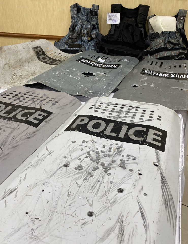 Бронепанели спецназа в Алматы. Следы от огнестрельного оружия и металлолома.