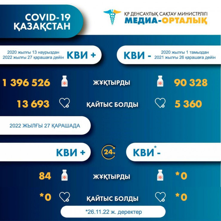 В Казахстане вновь отмечается снижение заболеваемости коронавирусной инфекцией. За сутки, 27 ноября, зарегистрировали 84 новых зараженных, передает Tengrinews.kz со ссылкой на данные Минздрава.