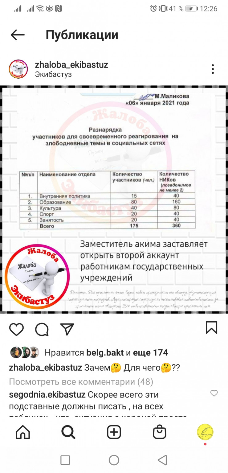 В одном из местных пабликов опубликована таблица, в которой якобы отражено количество аккаунтов, имеющихся у служащих отделов акимата. "Разнарядка участников для своевременного реагирования на злободневные темы в социальных сетях" от 6 января 2021 года якобы подписана заместителем акима Мариям Маликовой.