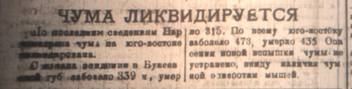 "По последним сведениям Наркомздрава чума на юго-востоке ликвидирована. В Букеевской губернии заболело 339 и умерло 315. По всему юго-востоку заболело 473, умерло 435. Опасения новой вспышки чумы не устранено, ввиду чумной эпидемии мышей", - сообщала "Советская степь".