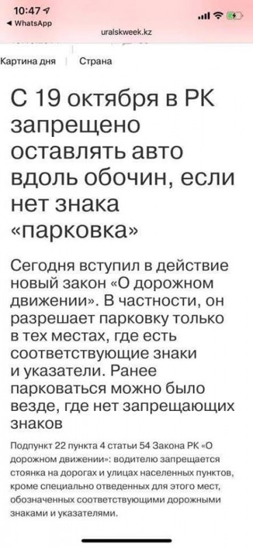 В рассылаемом в мессенджерах и соцсетях сообщении говорилось, что с 19 октября в Казахстане запретят оставлять авто вдоль обочин, если нет знака "парковка".